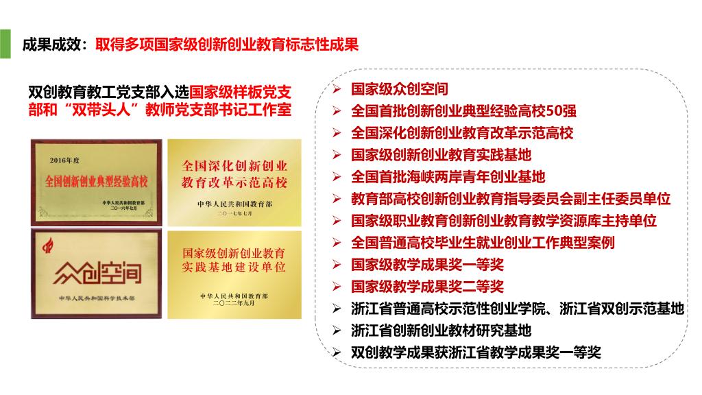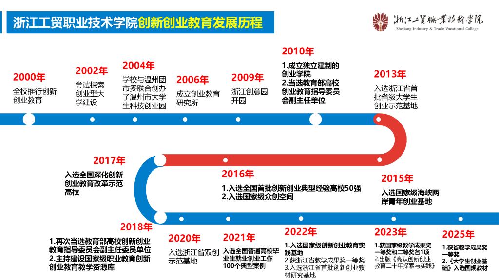 浙江工贸职业技术学院创新创业学院(区域文化研究中心、园区发展中心)植根于温州这片创新创业的沃土,立足创业型高校办学传统,紧扣“创新驱动发展,创业促进就业”的时代脉动,面向全体学生培养具有“创新精神、创客思维、创业实务、创业潜能”的高素质技术技能人才。学校于2000年开始推行创新创业教育,2009年与温州日报报业集团共建浙江创意园,为双创教育提供产业实践平台;2010年成立创业学院,依托园区分层分类推进双创人才培养。2014年开始全面实施“学园城融合”创新创业实践平台建设,全力打造“研训创融通”高职创新创业教学模式。学校先后获评全国首批创新创业典型经验高校50强、国家级众创空间、全国深化创新创业教育改革示范高校、全国普通高校毕业生就业创业工作百强典型案例、国家级创新创业教育实践基地、国家级教学成果奖一等奖和二等奖各1项,省级教学成果奖一等奖3项,学校连续两届当选教育部高校创新创业教育指导委员会副主任委员单位(高职唯一)。